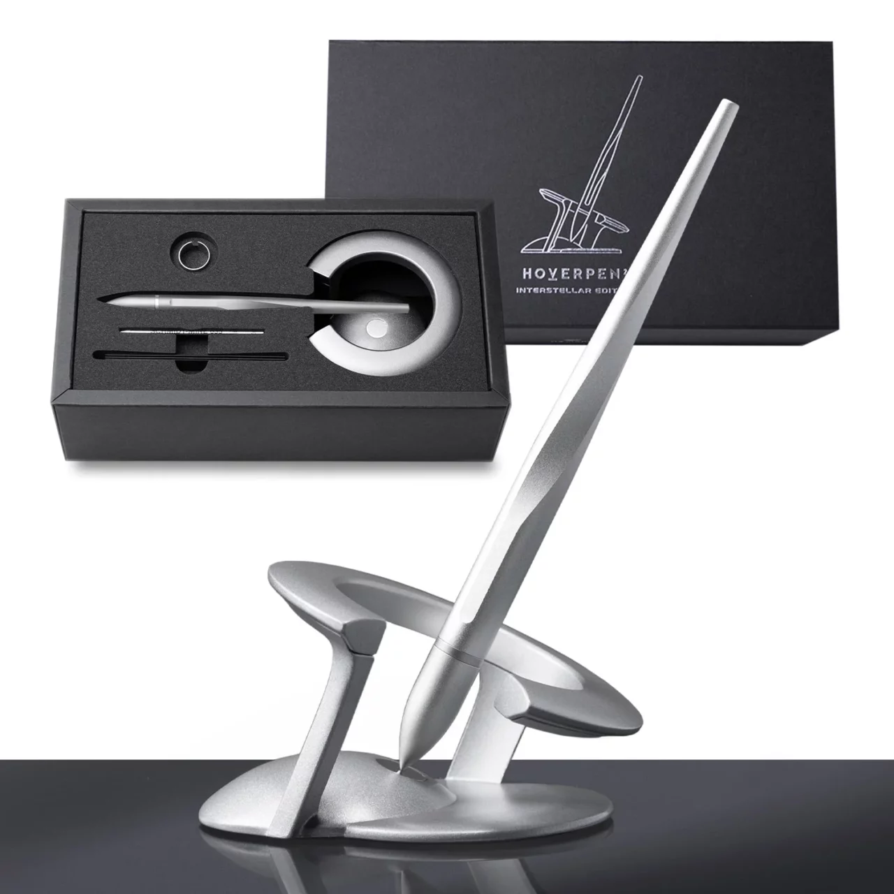 The pedestal of the Hoverpen 2.0 has a new design inspired by outer space. The pen keeps its suspended position thanks to the magnetic ring design, which gives it a “floating in space” effect.